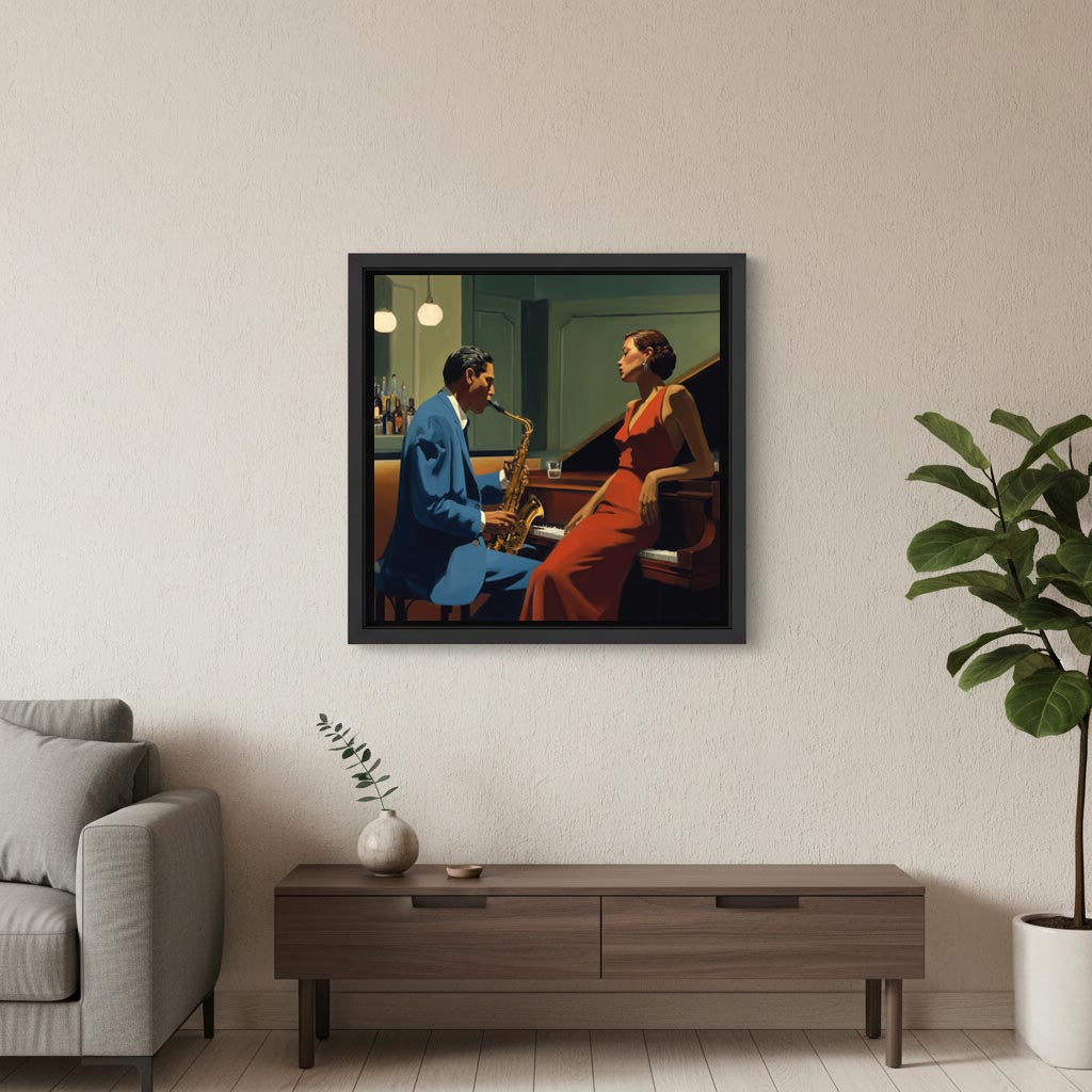 In the intimacy of a jazz bar, a saxophonist in a blue suit engages in a wordless dialogue with a woman in a red dress, seated against the piano. The glasses, the brass globes, the varnished wood: everything vibrates to the rhythm of a sustained note between them. With A Note Between Us, Le Yack composes a cinematic scene where music becomes narrative. The green light of the walls, the diagonal of the piano lid, the restraint of gestures—echoing a nocturnal Hopper—transform the moment into an elegant tension, between desire and silence. This work, part of the Nocturnes Américaines capsule collection published by Atelier Joconde, celebrates urban iconography and the female presence as a narrative force: a story of glances, poised on the brink of change.