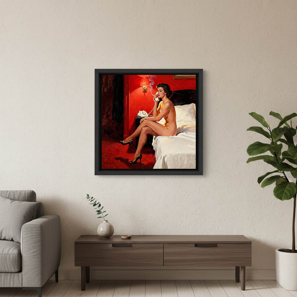 Waiting has its own beauty. This canvas is a window onto the intimacy of a hotel room or boudoir. The harsh light highlights the vulnerability of the nudity, contrasting with the sophisticated poise of the hairstyle and high heels. The woman's gaze, lost in thought, and her gesture, suspended on the phone, tell a story of love, heartbreak, or a secret. Here, the artist plays on the elegant voyeurism typical of Edward Hopper. The intense red of the walls reinforces the underlying passion, while the whiteness of the sheets casts a sculptural light on the body. A powerful work that questions communication and modern solitude.