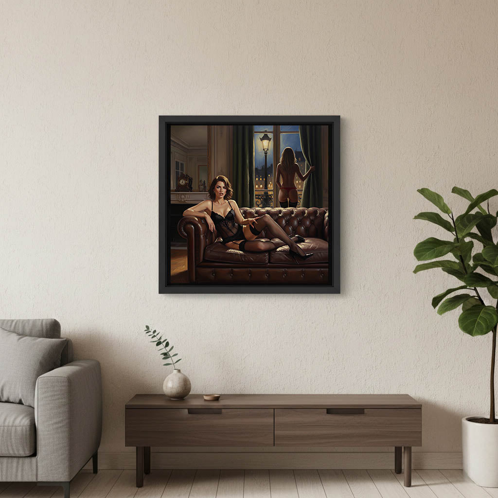 Two women in a Parisian living room: one languidly reclining on a sofa, the other at the window. Warm light, velvety leather, black lingerie… everything exudes the hushed tension of a nocturnal confession. Le Yack captures here the intimacy and mystery of contemporary desire, in an atmosphere that is both cinematic and pictorial.